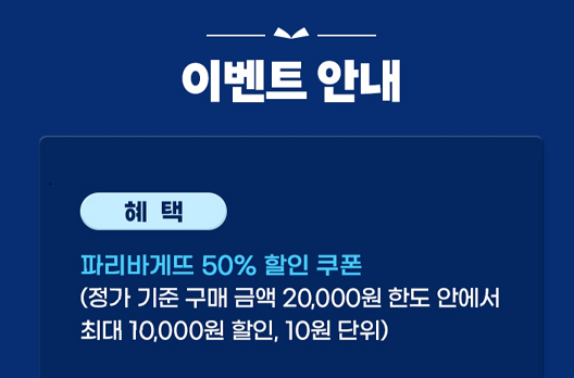 8/11~8/20, 오전 9시부터 파리바게뜨 50% 쿠폰이 열립니다.